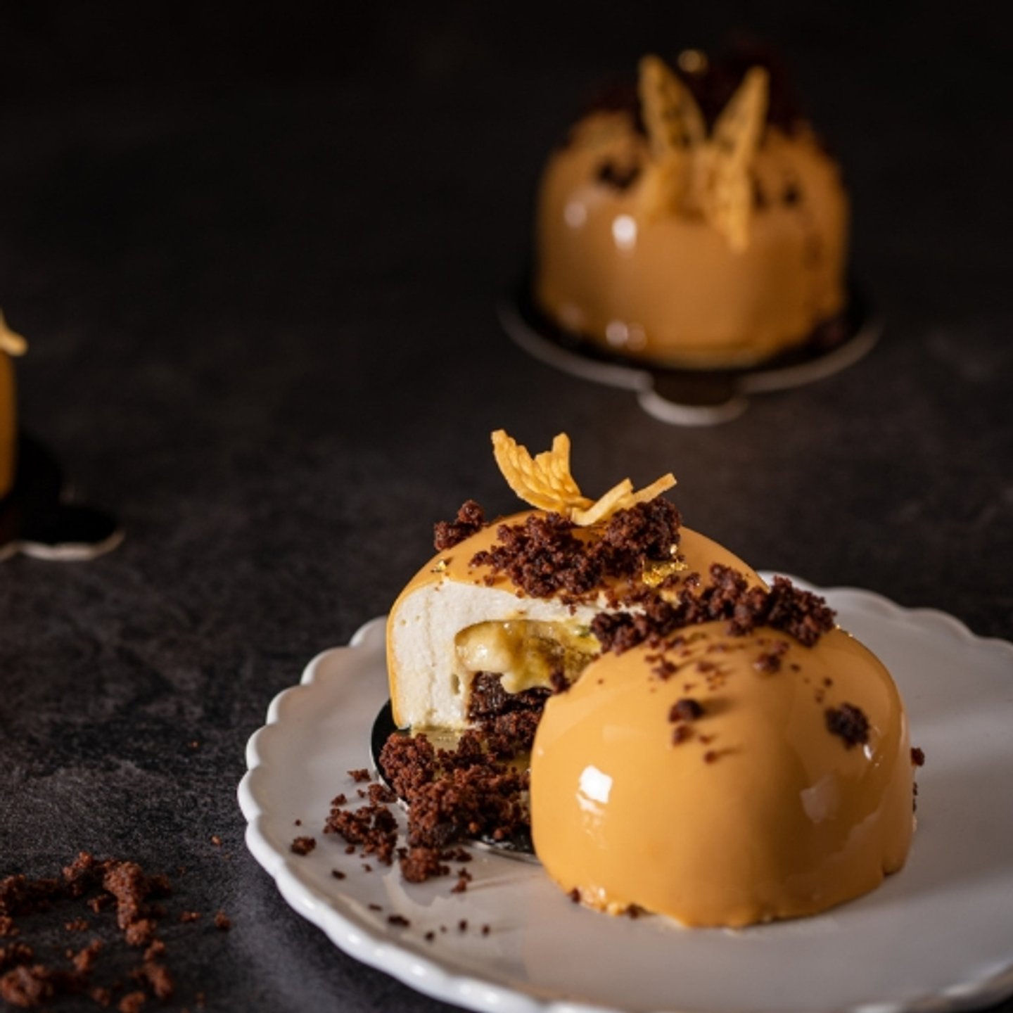 Zrcadlová poleva z pravé bílé čokolády s bohatou chutí slaného karamelu. Vytváří dokonale hladký a lesklý povrch v elegantním karamelovém tónu, který dodá dezertům profesionální vzhled. Díky své intenzivní chuti a jemné konzistenci stačí použít pouze tenkou vrstvu, která nechá vyniknout samotnému dezertu.