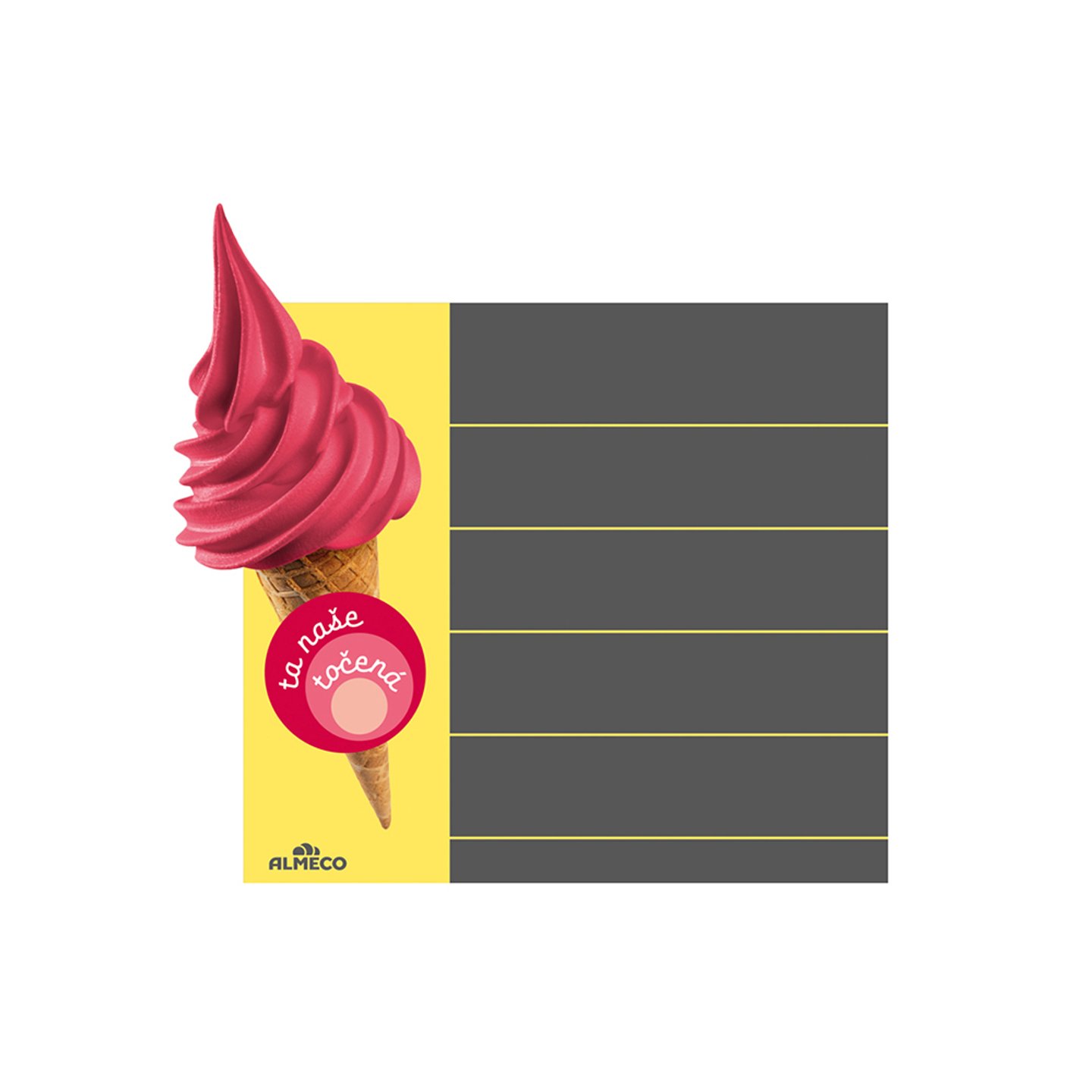 Žlutá nástěnná tabule s motivem jahodové točené z kolekce „ta naše točená“ je praktickým pomocníkem i stylovým prvkem vaší prodejní zóny. Zákazníci na první pohled uvidí, co dnes nabízíte – ať už příchutě, ceny, nebo krátký vzkaz. Tabule se jednoduše připevní pomocí samolepky a ihned je připravena na popis křídovým fixem.