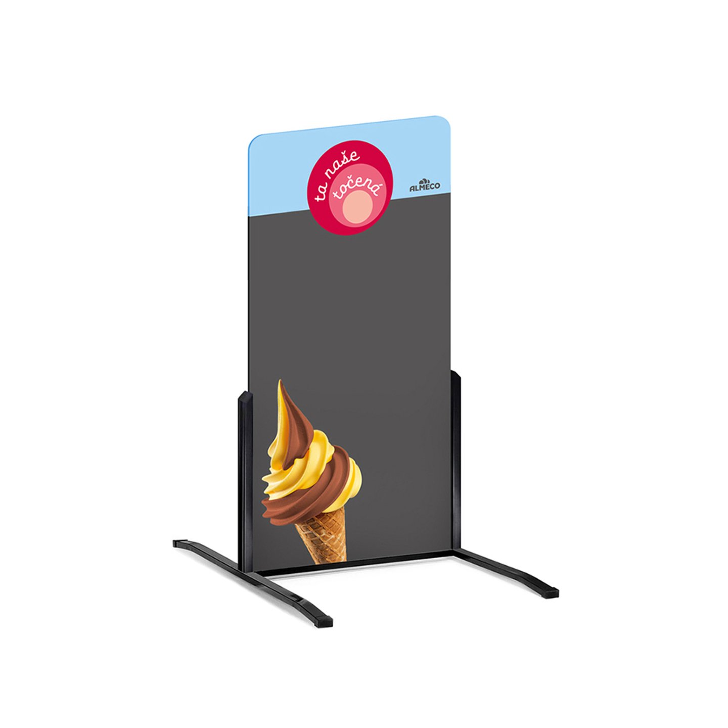 Stojící tabule v modré variantě s motivem vanilka/čoko z kolekce „ta naše točená“ je praktickým i vizuálně atraktivním doplňkem vašeho prodejního místa. Ideální pro denní nabídku, akce nebo vzkazy zákazníkům. Díky odolné konstrukci a kvalitnímu povrchu pro popis křídovým fixem je připravená na každodenní provoz – a vypadá skvěle!