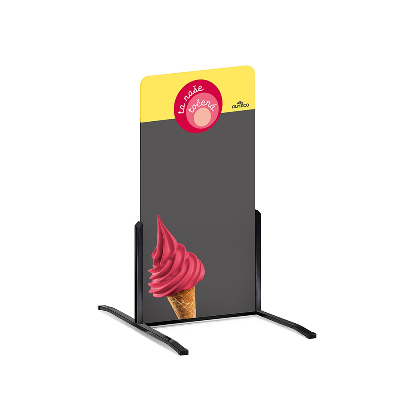 Žlutá tabule s motivem jahodové točené zmrzliny z kolekce „ta naše točená“ je nepřehlédnutelná – doslova vybízí k tomu, aby se zákazník zastavil a přečetl si, co zrovna nabízíte. Ideální pro denní menu, akční příchutě nebo vtipné nápisy, které přilákají další úsměv (a zákazníka).