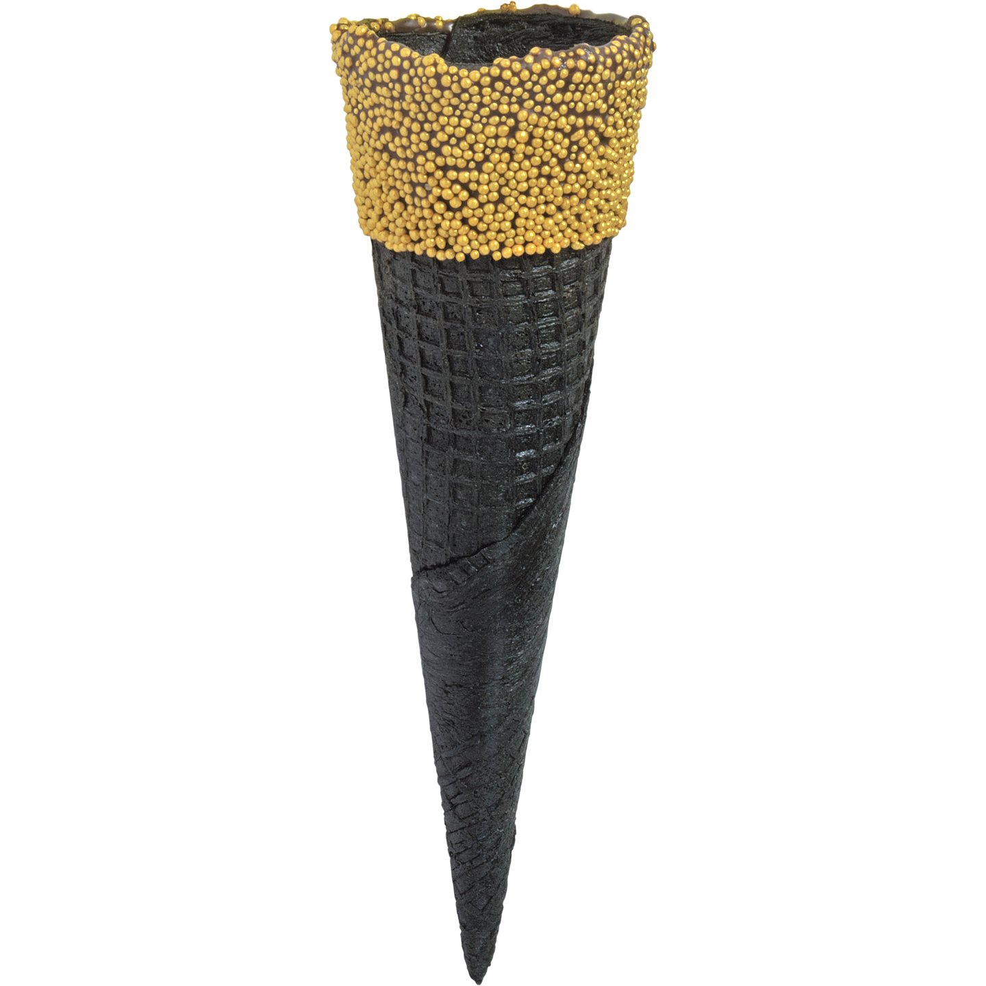 Elegantní černý vaflový kornout zdobený kakaovou polevou a zlatými cukrovými perličkami. Luxusní vzhled a precizní zpracování dělají z tohoto kornoutu dokonalý doplněk prémiové zmrzliny.