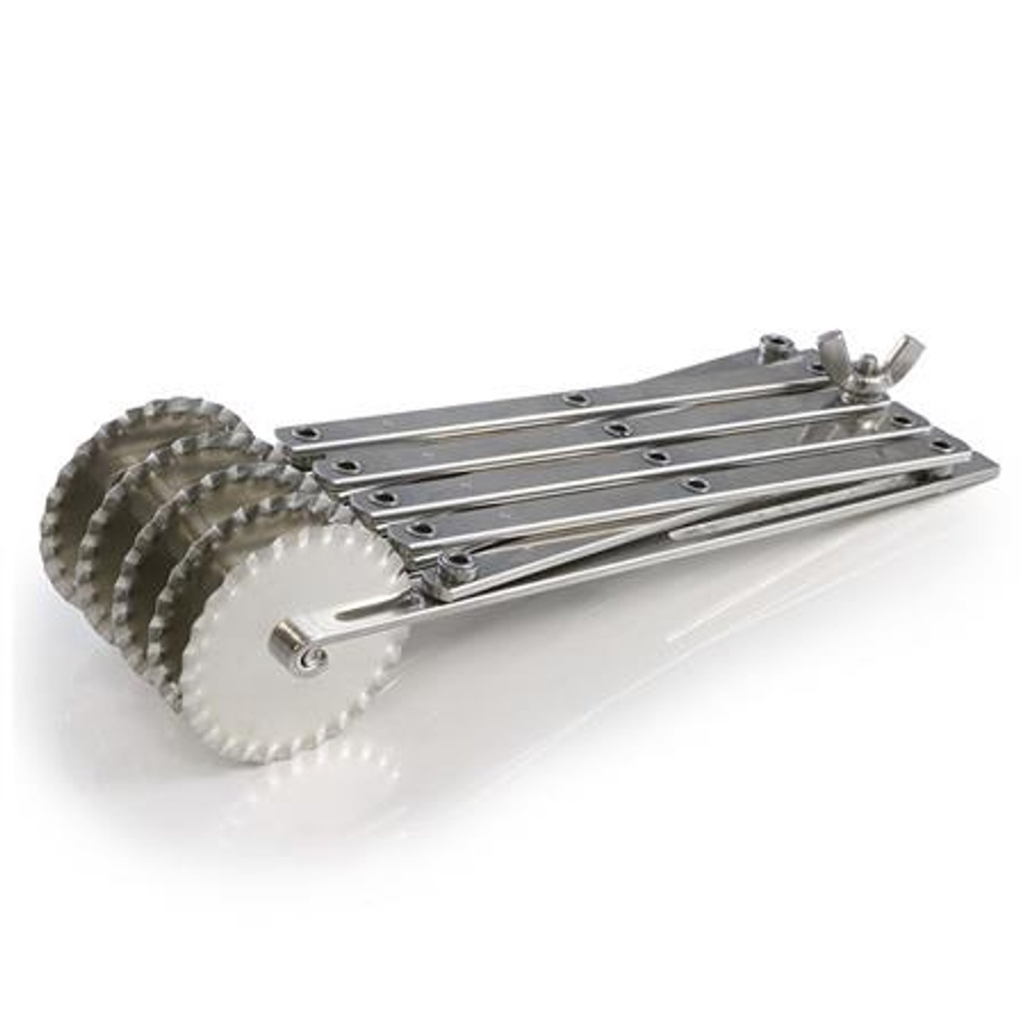 Kráječ z nerezové oceli se 5 řezáky a vlnkovým dekorem.