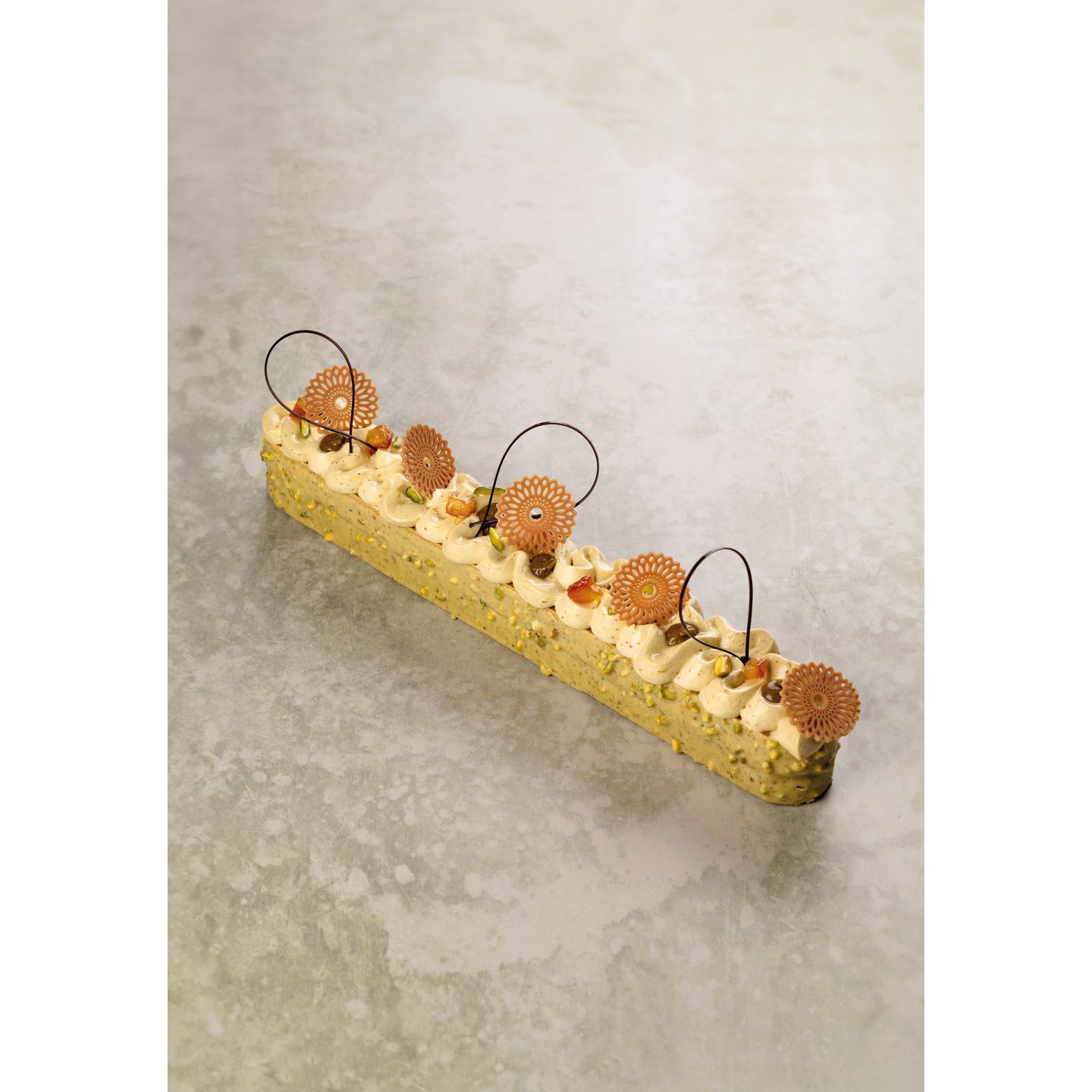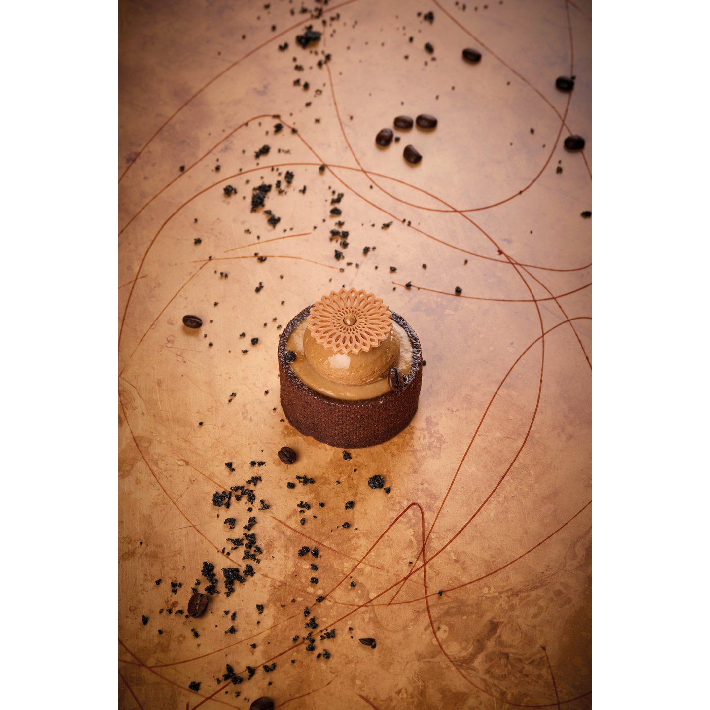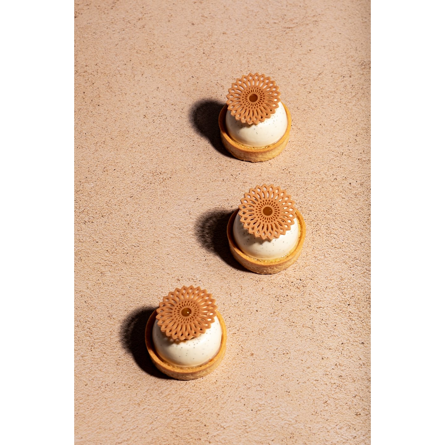 Čokoládová dekorace DOBLA ve tvaru filigránové kytičky, ideální pro slavnostní a jarní cukrářské kolekce. Jemný detail a čistý design dodají dortům, zákuskům i dezertům elegantní dekorativní akcent.