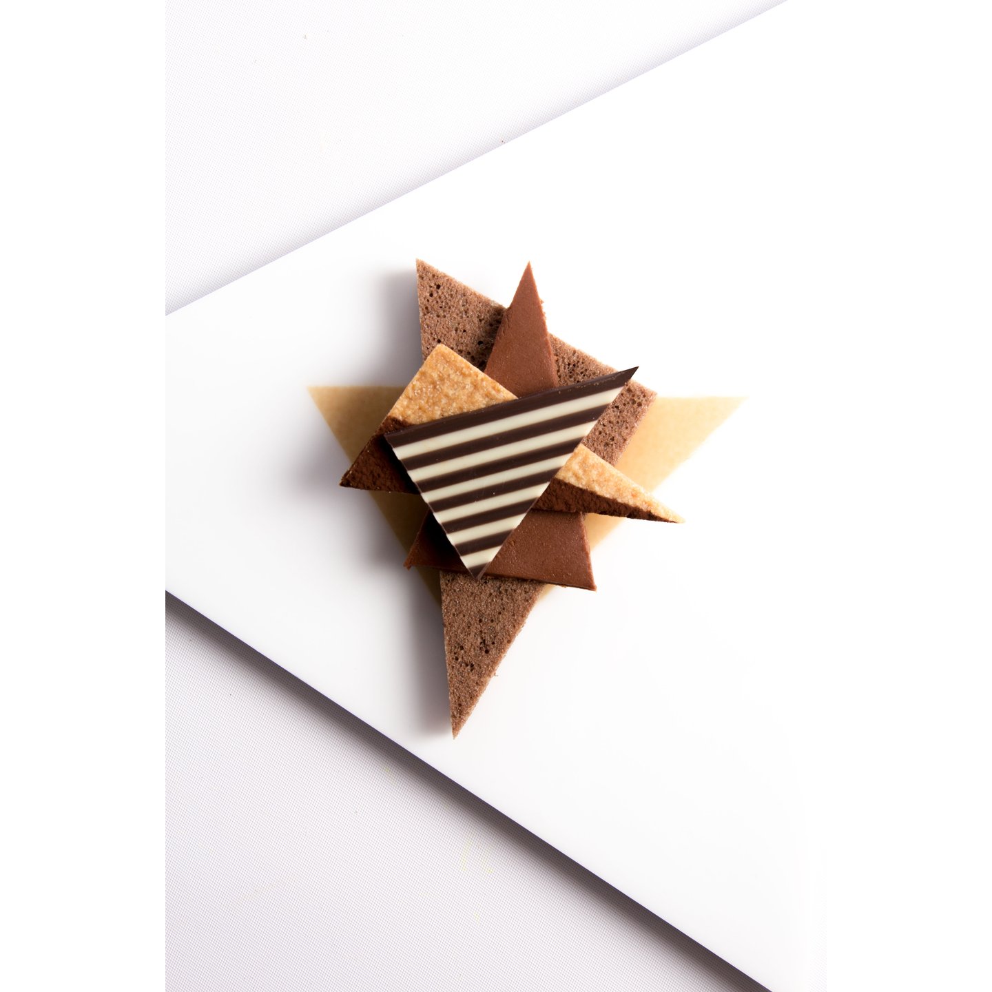 Čokoládová dekorace DOBLA ve tvaru trojúhelníku s domino pruhem dodá dezertům moderní a elegantní vzhled. Stylová kombinace tmavé a světlé čokolády vytváří výrazný kontrast, který skvěle vynikne.