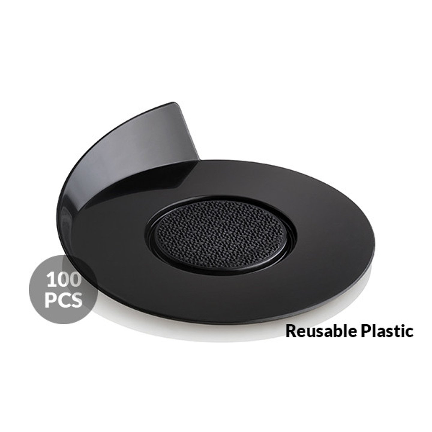 Černý kulatý podnos pod dezert z opakovatelně použitelného plastu.