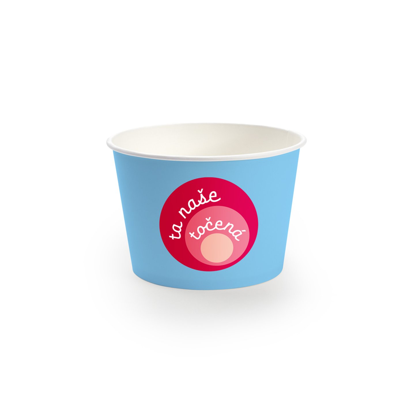 Papírové kelímky na zmrzlinu modré barvy s potiskem "TA NAŠE TOČENÁ"
