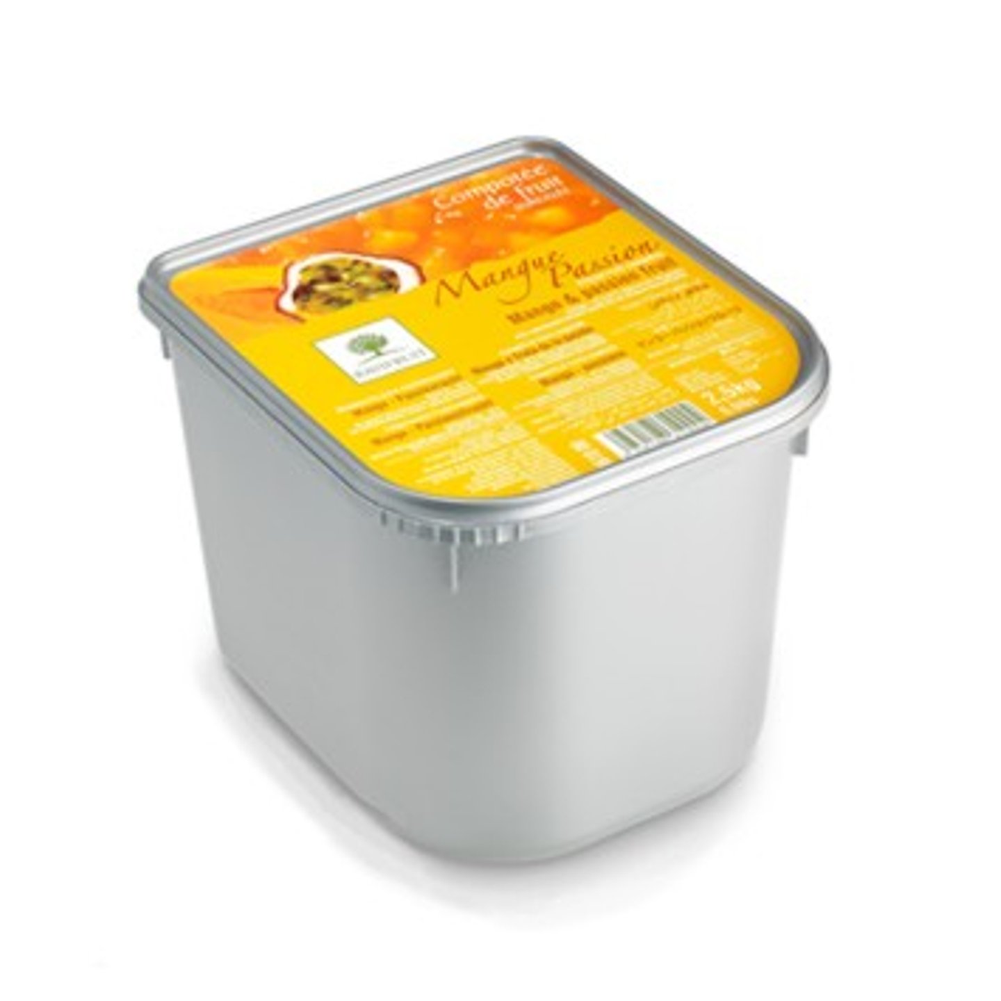 Mražený kompot MANGO - MARACUJA obsahuje 74% pyré z manga a maracuji.