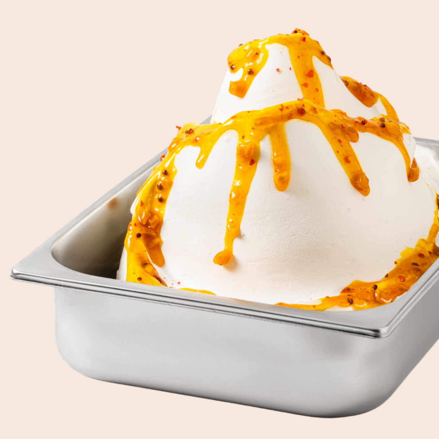 Objevte intenzitu zralého manga v podobě chutney, která přináší do zmrzliny inspiraci světovou gastronomií. Sladká, šťavnatá a jemná dužina manga dodává chuti plnost, zázvor přináší lehkou pikantnost a růžový pepř jemně aromatický dozvuk. Vzniká tak elegantní a překvapivý kontrast, který podtrhne smetanové i rostlinné základy a vytvoří nezapomenutelný chuťový zážitek.