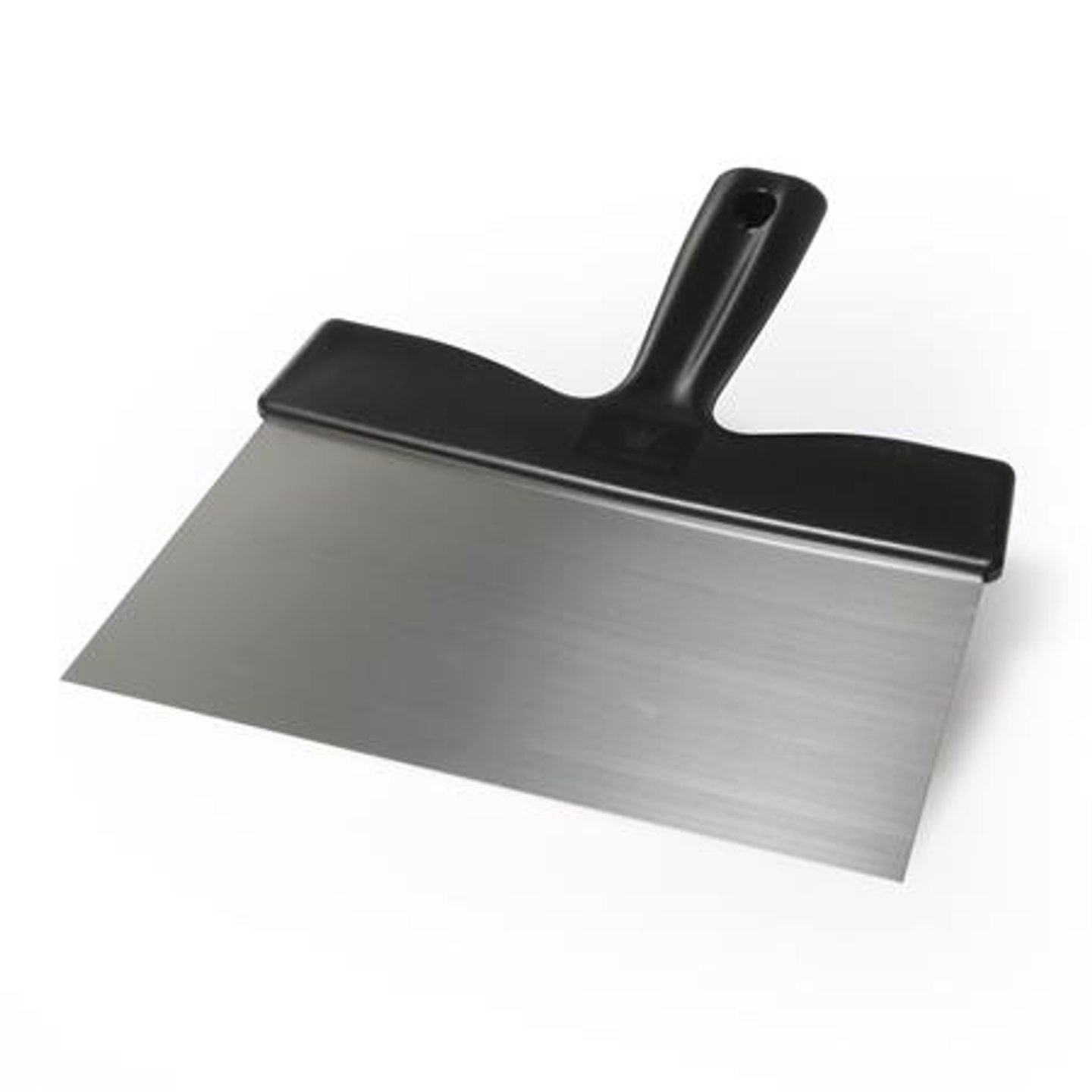 Karta z nerezové oceli s rovnou čepelí a černou rukojetí.