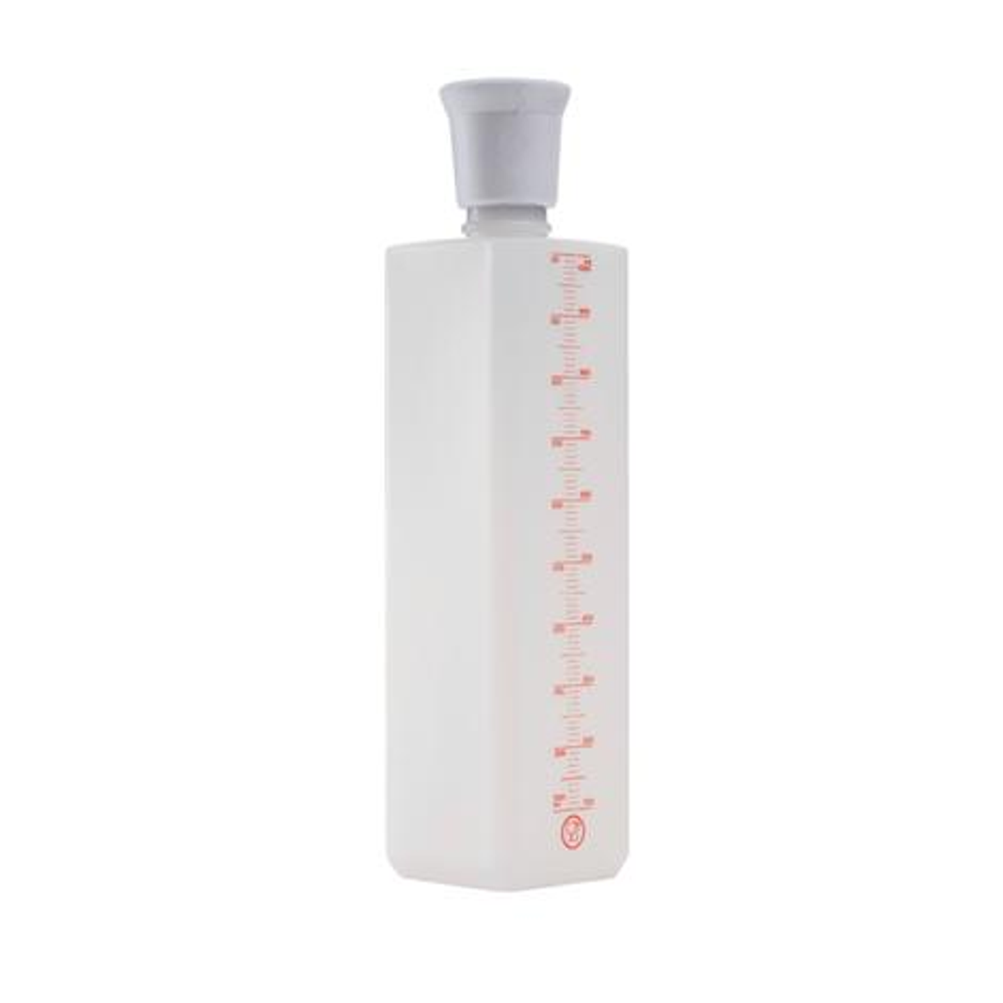 Hranatá plastová odměrná láhev s bílým uzávěrem a kropícím víkem.