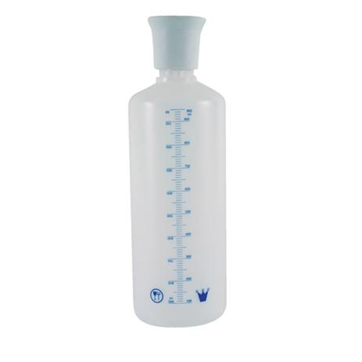 Kulatá plastová odměrná láhev s oranžovou ryskou,s kropicím víčkem.