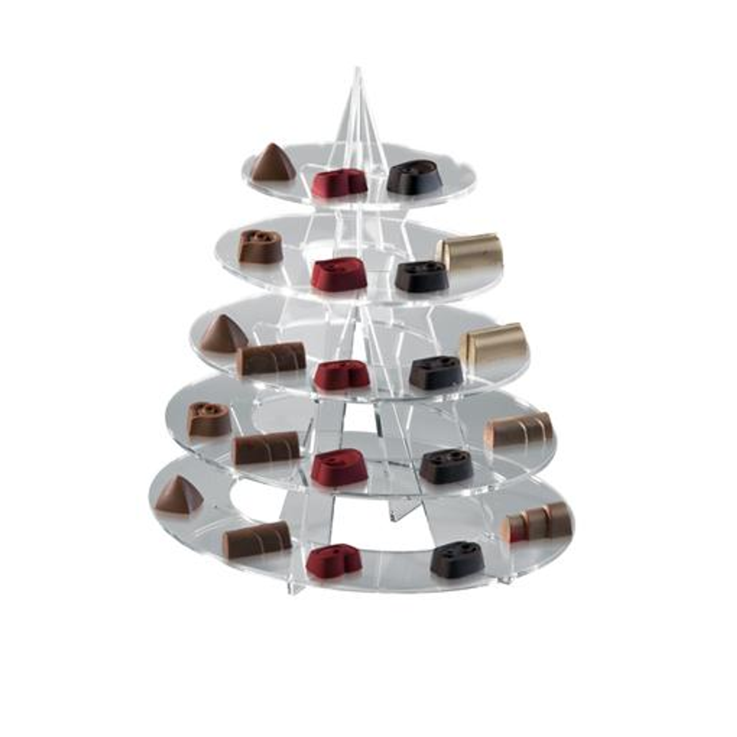 Průhledný stojan pětipatrový, který je vhodný na pralinky a mignony.