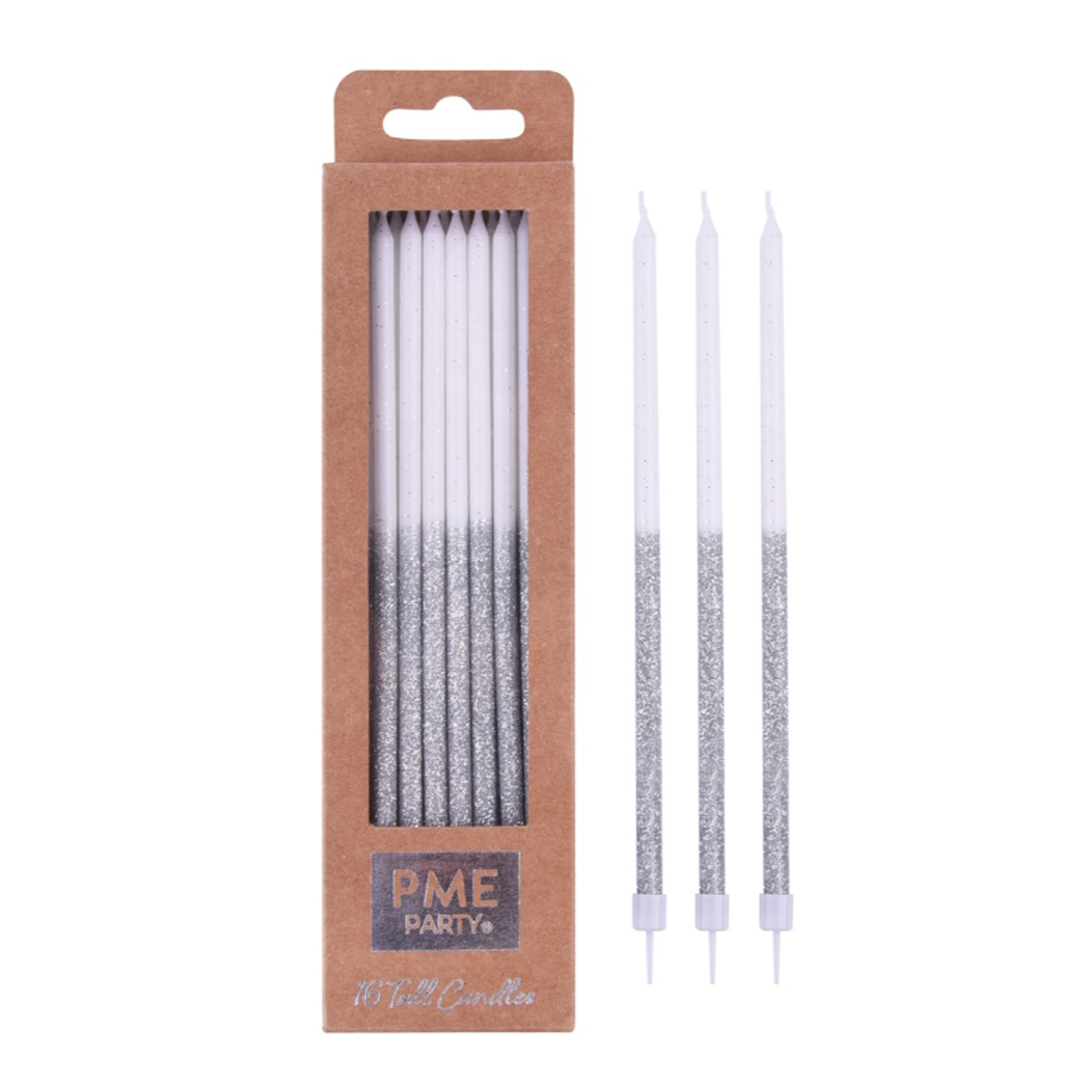 Dortové voskové svíčky na narozeninový dort se stříbrnými třpytkami.