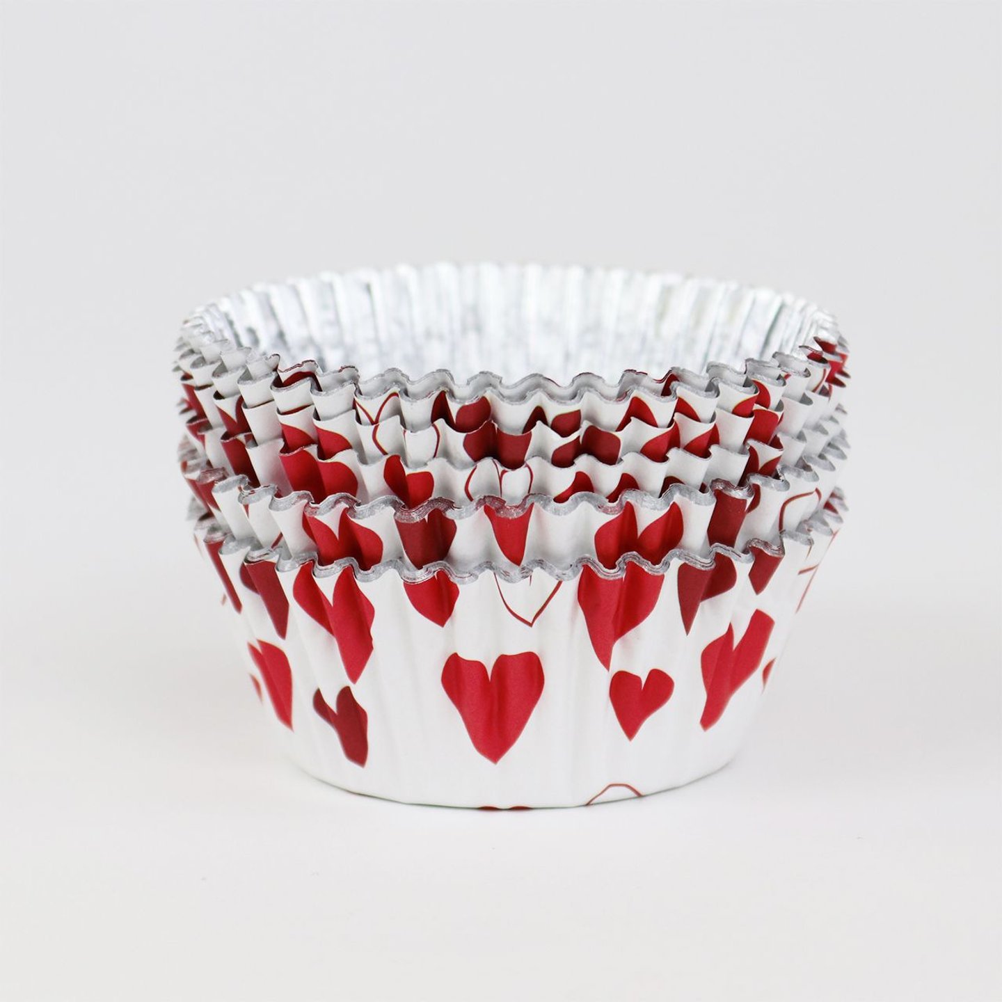 Designové papírové košíčky na muffiny bílé barvy s červenými srdíčky.