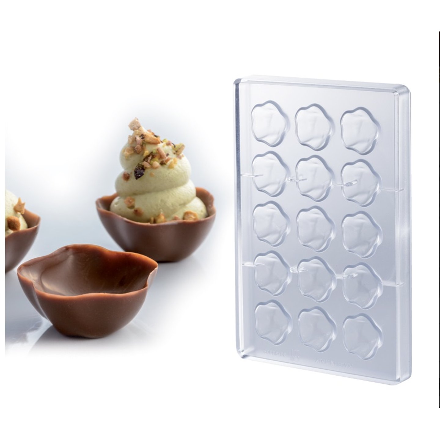 Polykarbonátová forma vhodná k vylití čokoládových korpusů ve tvaru misek.