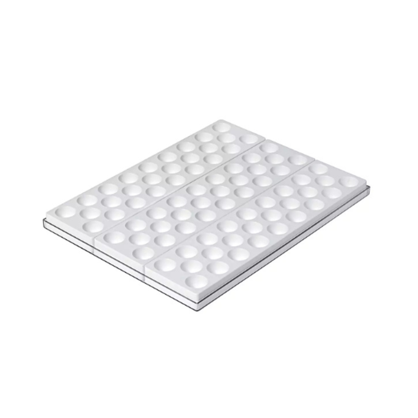 Set obsahuje 3 silikonové formy a stabilní podnos o velikosti 30 × 40 cm, který usnadňuje manipulaci při plnění, mražení i přenášení forem. Každá forma má 26 dutin o objemu přibližně 12 ml, což umožňuje efektivní výrobu většího množství dekorací najednou – ideální pro cukrárny, zmrzlinárny i gastronomické provozy.