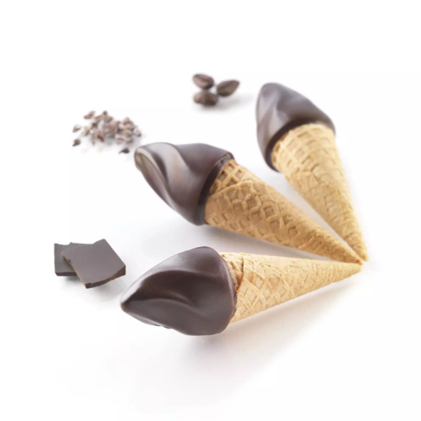 Silikonová forma Silikomart Conoflex je profesionální forma určená pro snadnou a rychlou výrobu čokoládových špiček na zmrzlinové kornouty. Speciální tvar dutin umožňuje vytvořit realistický efekt krémové špičky.
