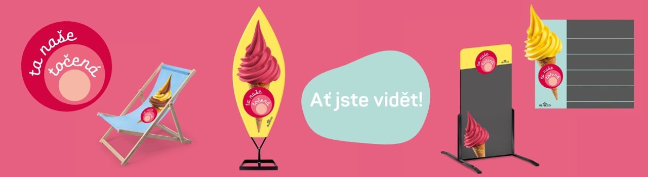 Chcete dát světu vědět, že u vás točíte tu nejlepší zmrzlinu? Vybavte svůj provoz stylovými propagačními předměty ve vizuálu značky „ta naše točená“. V nabídce najdete vše od vlajek, tabulí, stojanů a slunečníků až po samolepky, placky a praktické zástěry. Vše laděné do barev, které přitáhnou pozornost a vytvoří lákavou atmosféru pro vaše zákazníky.