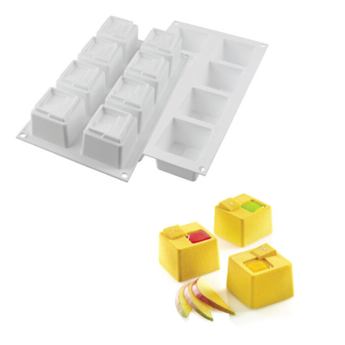 Čtvercový tvar je ideální pro moderní mousse dezerty se sametovým efektem, zrcadlovou glazurou nebo ovocným insertem, který je umístěný v horní části dezertu a vytváří elegantní kontrast.