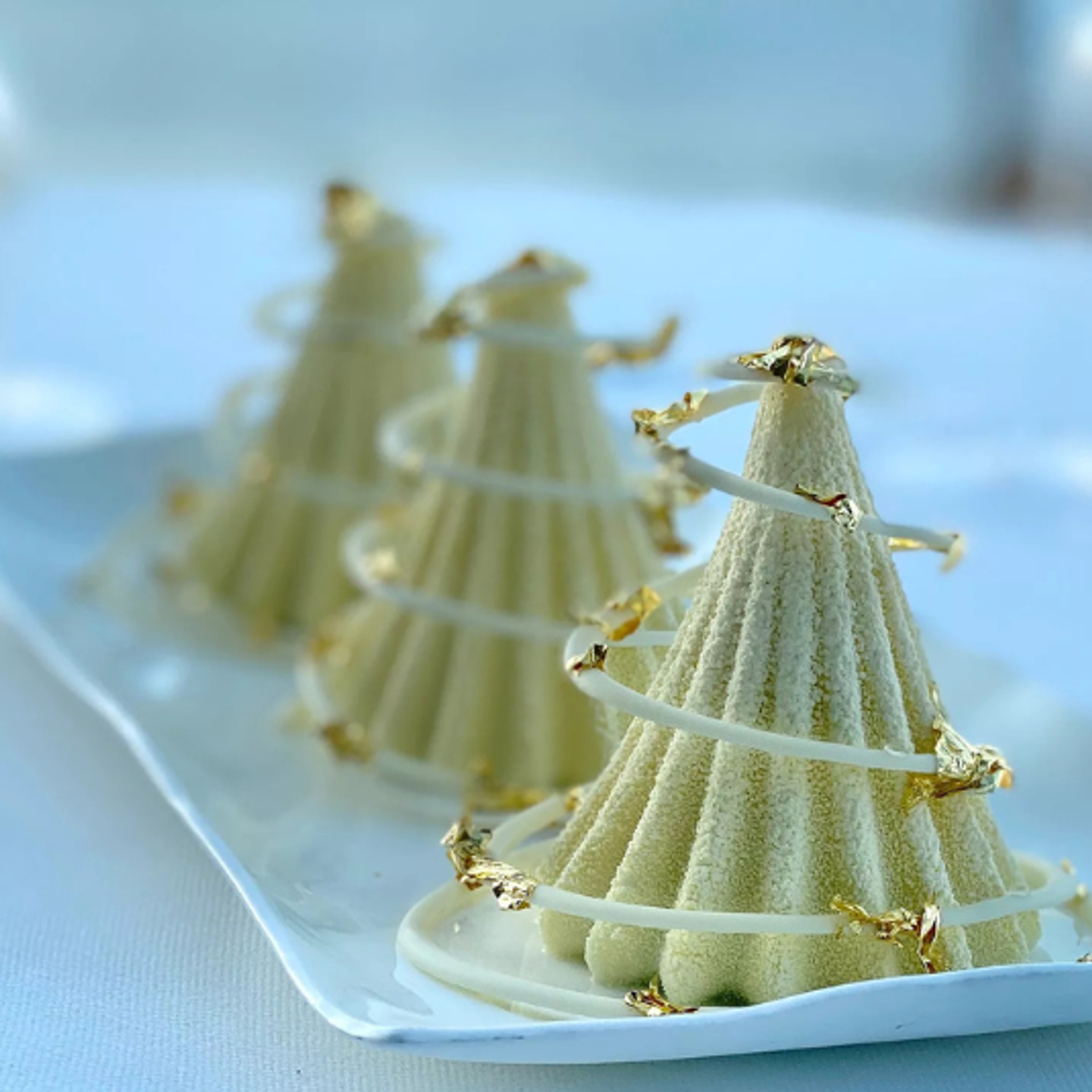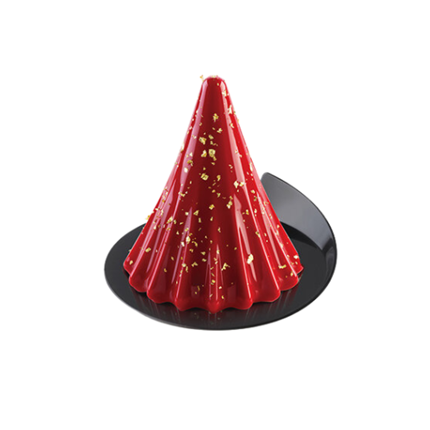 Trojrozměrný design dezertu krásně vynikne při použití zrcadlové glazury nebo metalických dekorů, které zvýrazní jednotlivé linie a dodají dezertu luxusní vzhled.