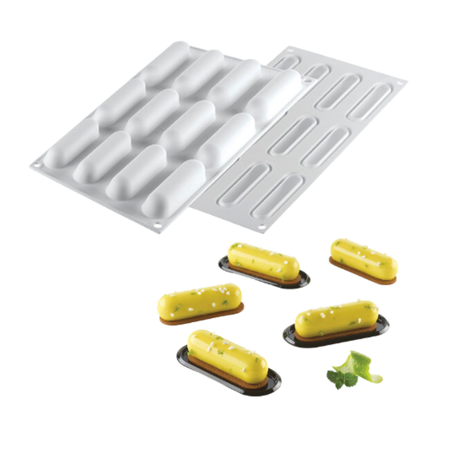 Podlouhlý tvar je ideální pro moderní vitrínové dezerty inspirované tvarem éclairu, které lze dekorovat zrcadlovou glazurou, čokoládou nebo jemnými krémovými dekoracemi.