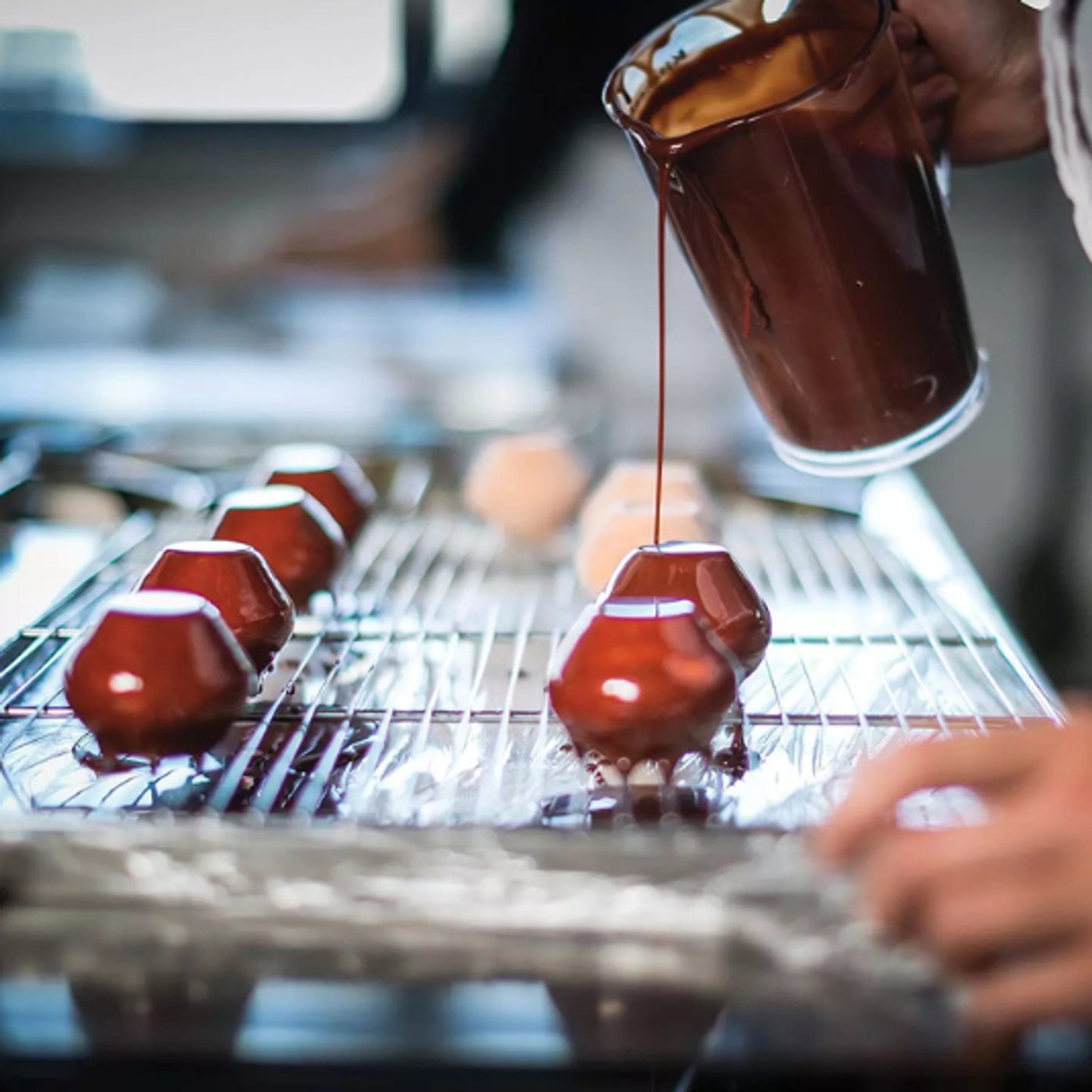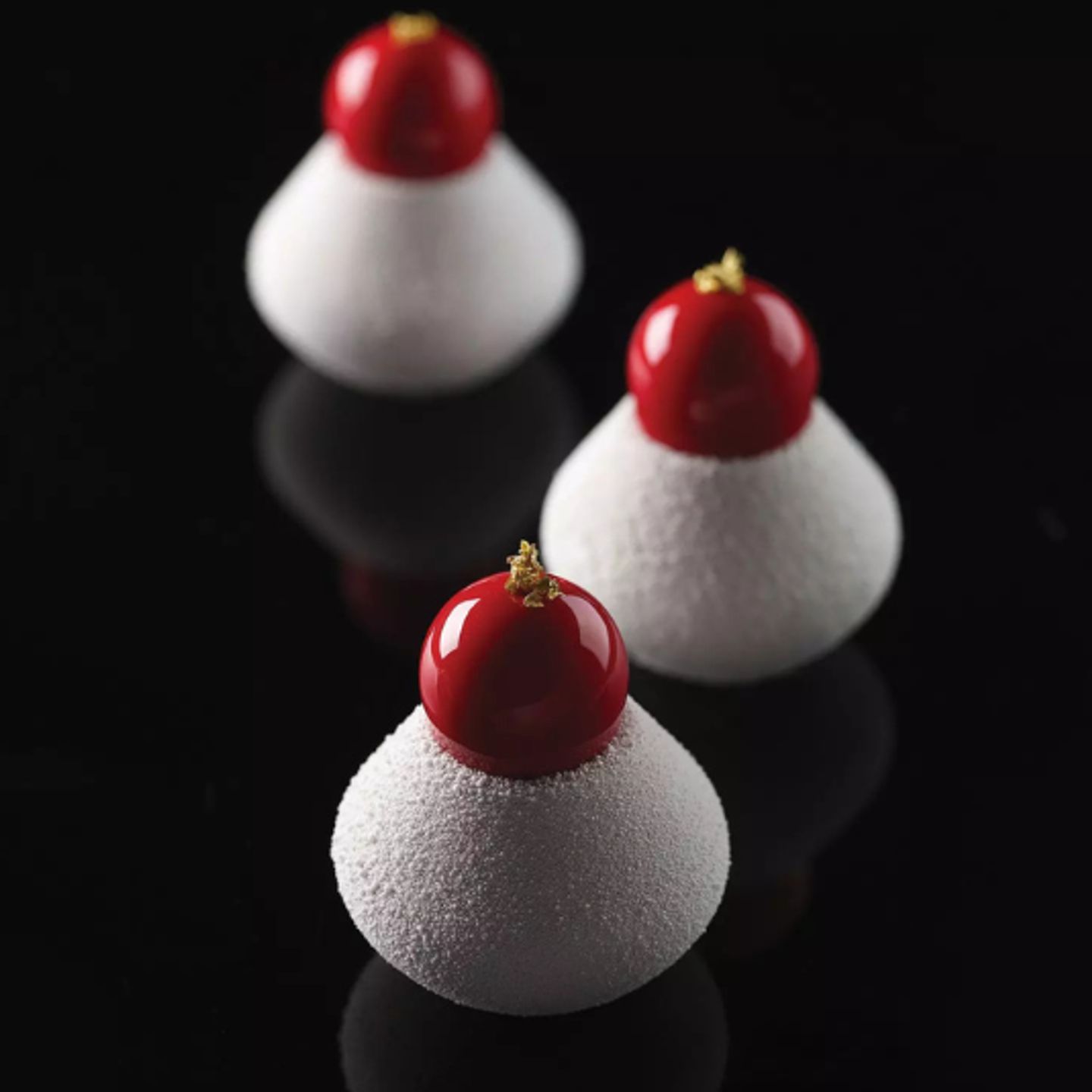 Pro výrazný vizuální efekt použijte kontrastní povrchy – například sametový efekt na spodní části a lesklou zrcadlovou polevu na horní kouli. Vznikne tak elegantní dezert připomínající luxusní parfém.