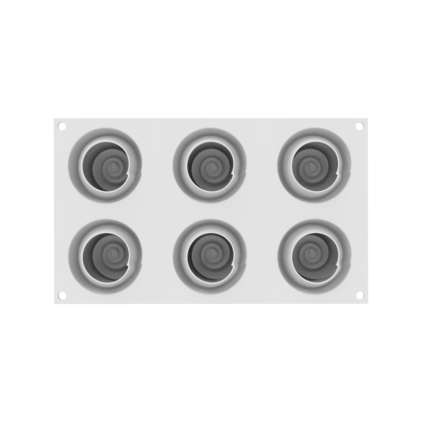 Silikonová forma Silikomart Givré 30 umožňuje vytvářet elegantní mignon dezerty s jemným spirálovým designem, který připomíná rozvíjející se květ. Díky svému sofistikovanému tvaru dodá malým dezertům moderní a luxusní vzhled ve vitríně.