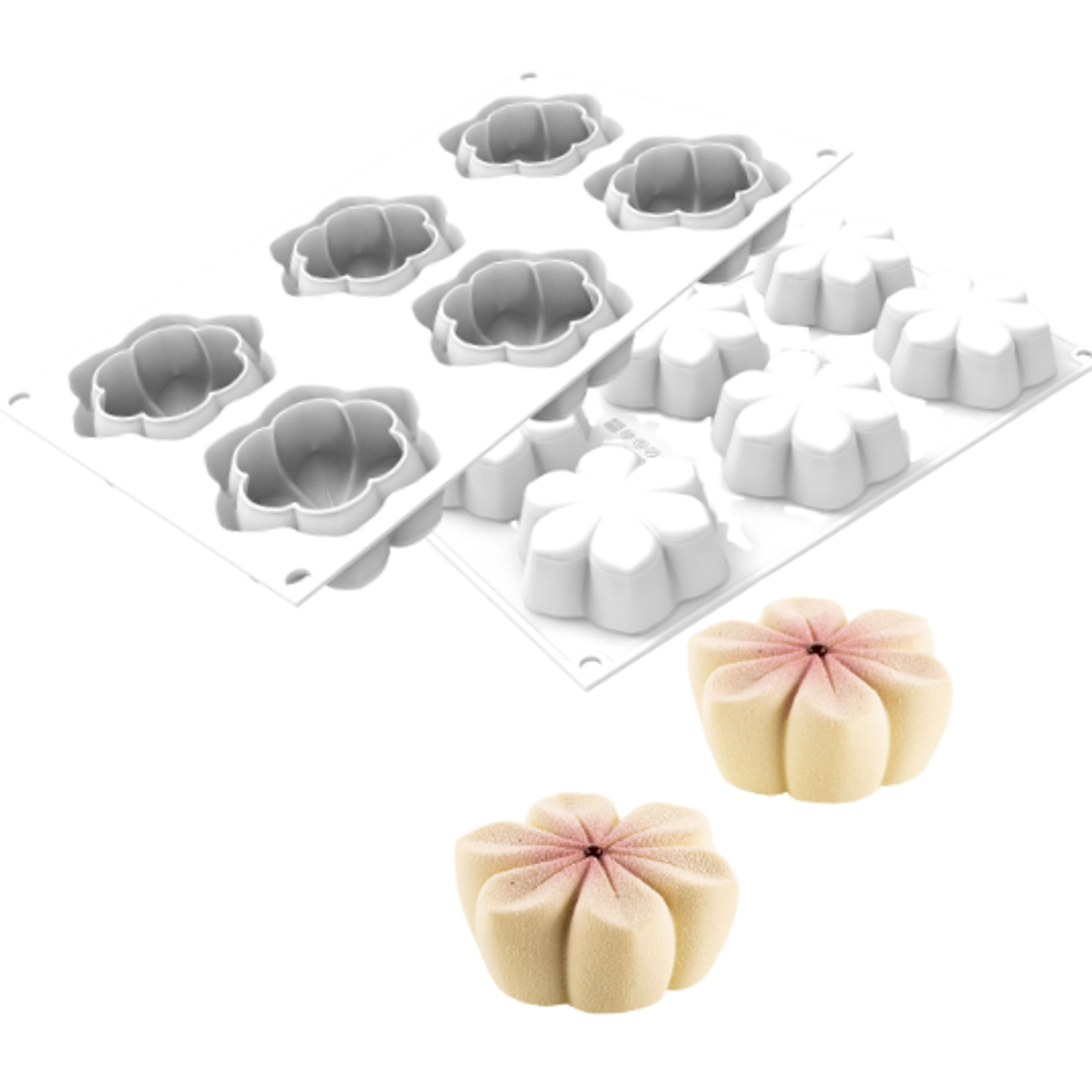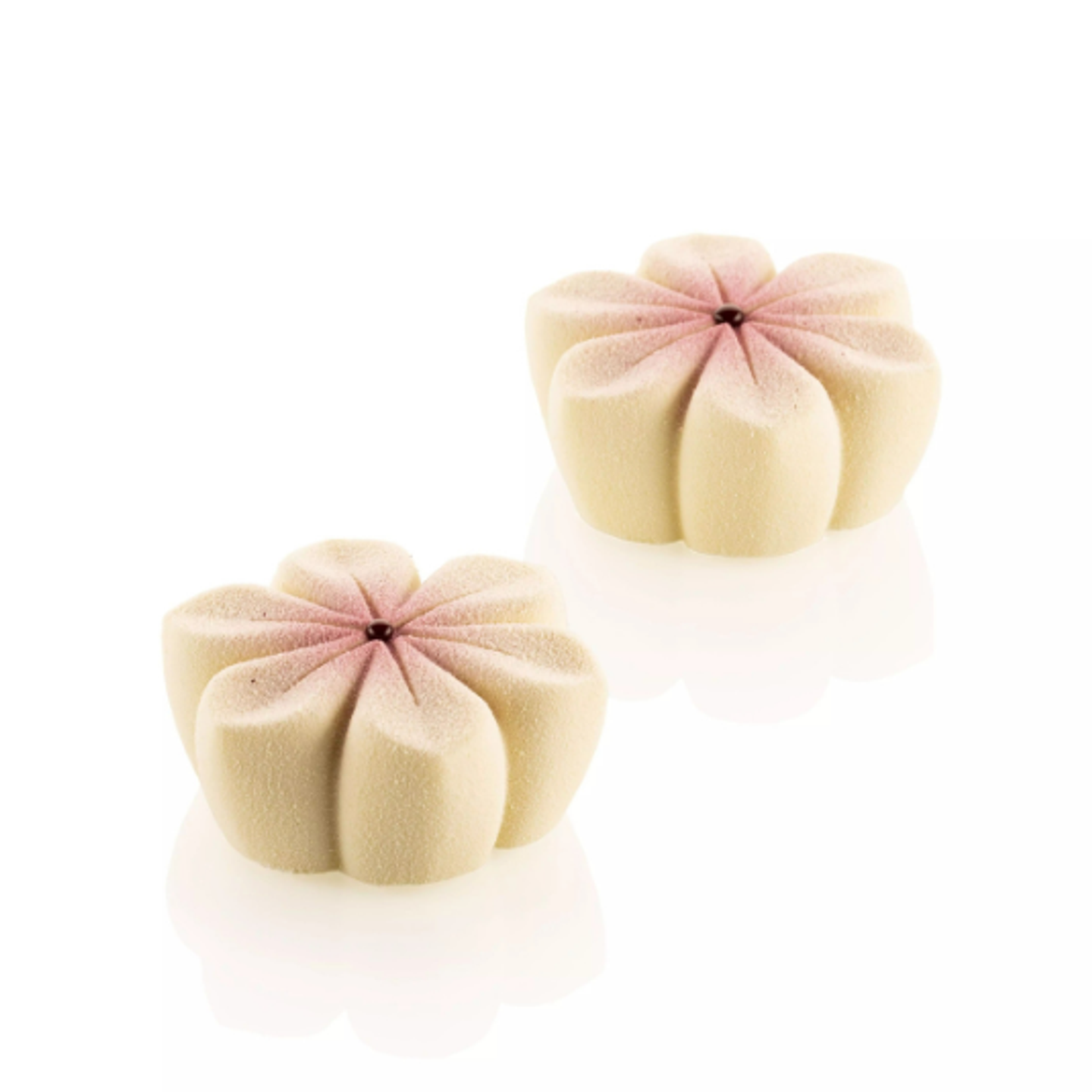 Květinový tvar krásně vynikne při použití jemného sametového efektu nebo pastelových zrcadlových polev, které zvýrazní jednotlivé „okvětní lístky“ dezertu. Ideální pro jarní a svatební dezerty.