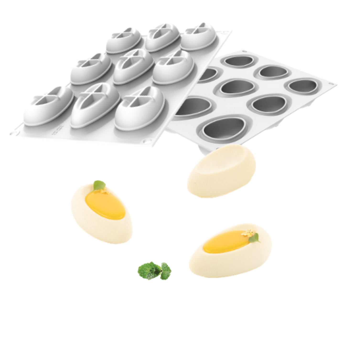 Obsahuje 9 dutin o objemu 40 ml, ideálních pro přípravu mousse dezertů, semifreddo nebo pečených mini dezertů. Díky zapuštěné části na povrchu lze dezert snadno doplnit například ovocným coulis, gelée, krémem nebo polevou, což vytváří zajímavý kontrast mezi strukturou a lesklým středem.