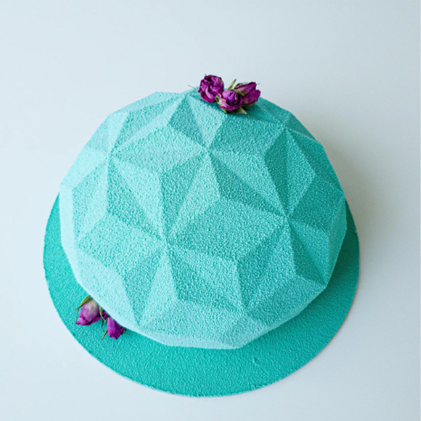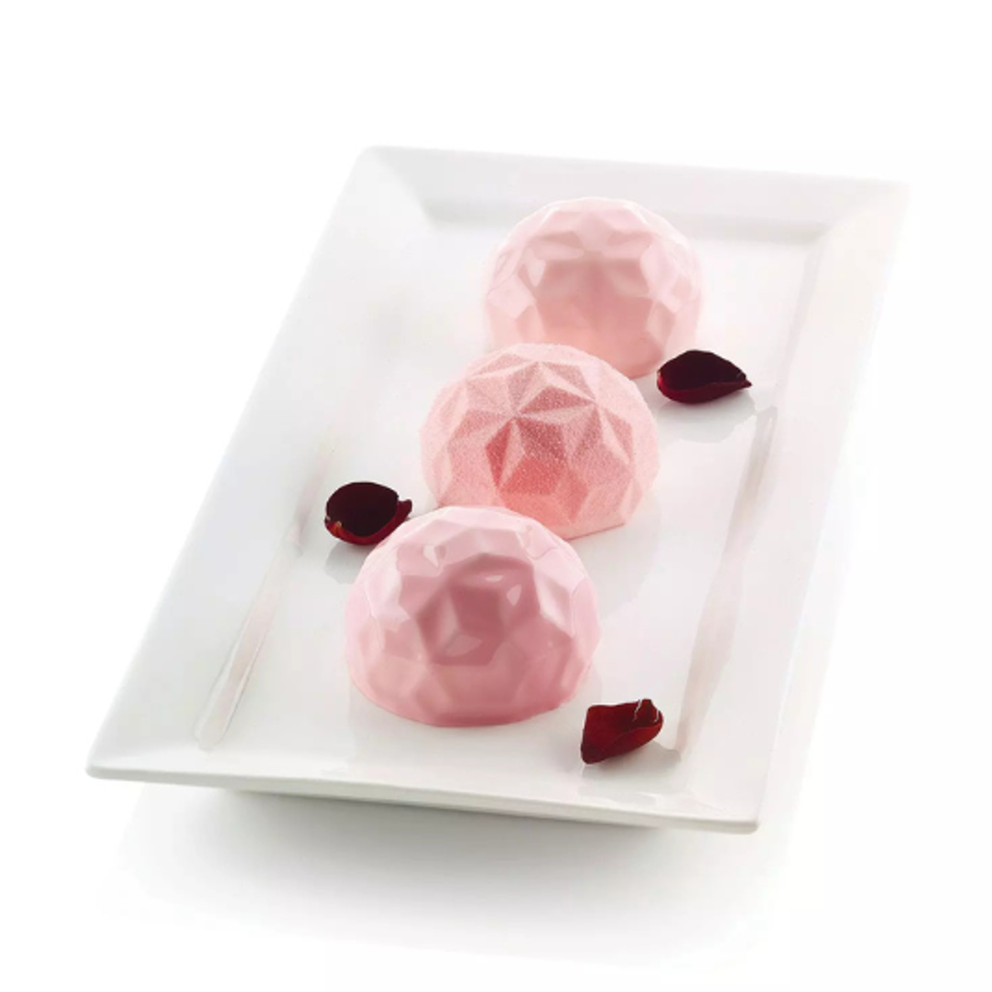 Fasetový povrch dezertu krásně vynikne při použití velvet efektu, jemného perleťového spreje nebo zrcadlové polevy, díky kterým dezert ještě více připomíná skutečný drahokam.