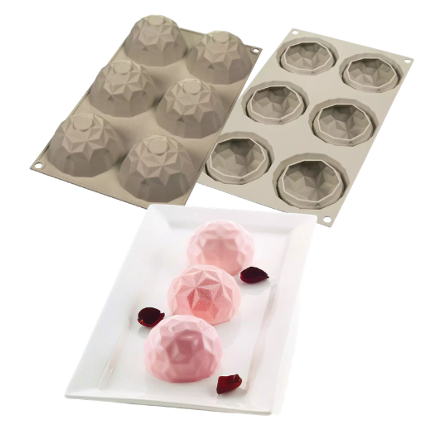 Forma Mini Gemma od Silikomart zaujme designem inspirovaným broušeným drahokamem. Její výrazná fasetová struktura dodává dezertům elegantní a luxusní vzhled, který okamžitě upoutá pozornost ve vitríně i při servírování na talíři.