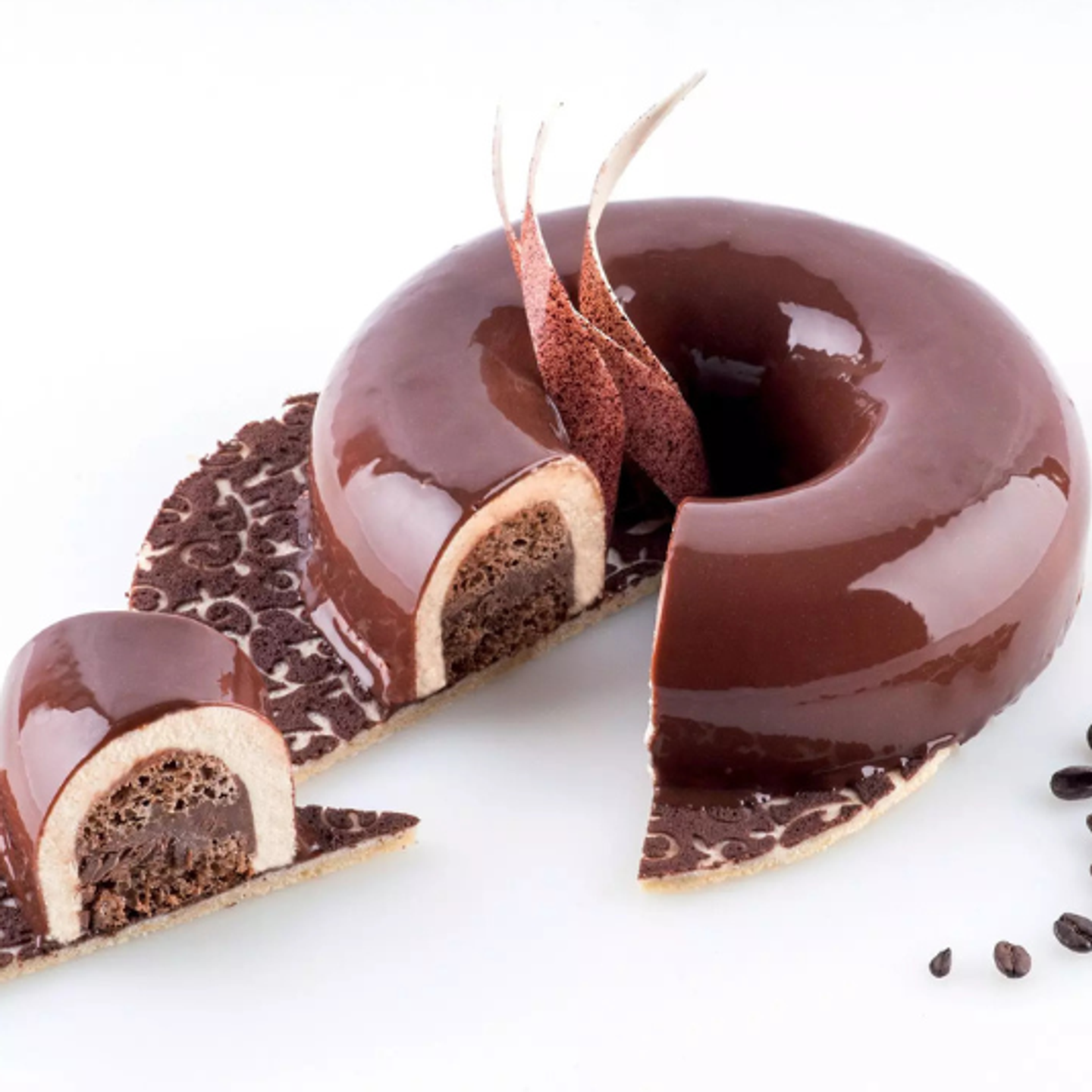 Střed formy využijte pro výrazný kontrast – například čerstvé ovoce, krém nebo křupavý prvek. Povrch dortu skvěle vynikne s mirror glazurou, která vytvoří hladký a lesklý efekt, případně můžete kombinovat lesk a mat pro zajímavější vzhled.