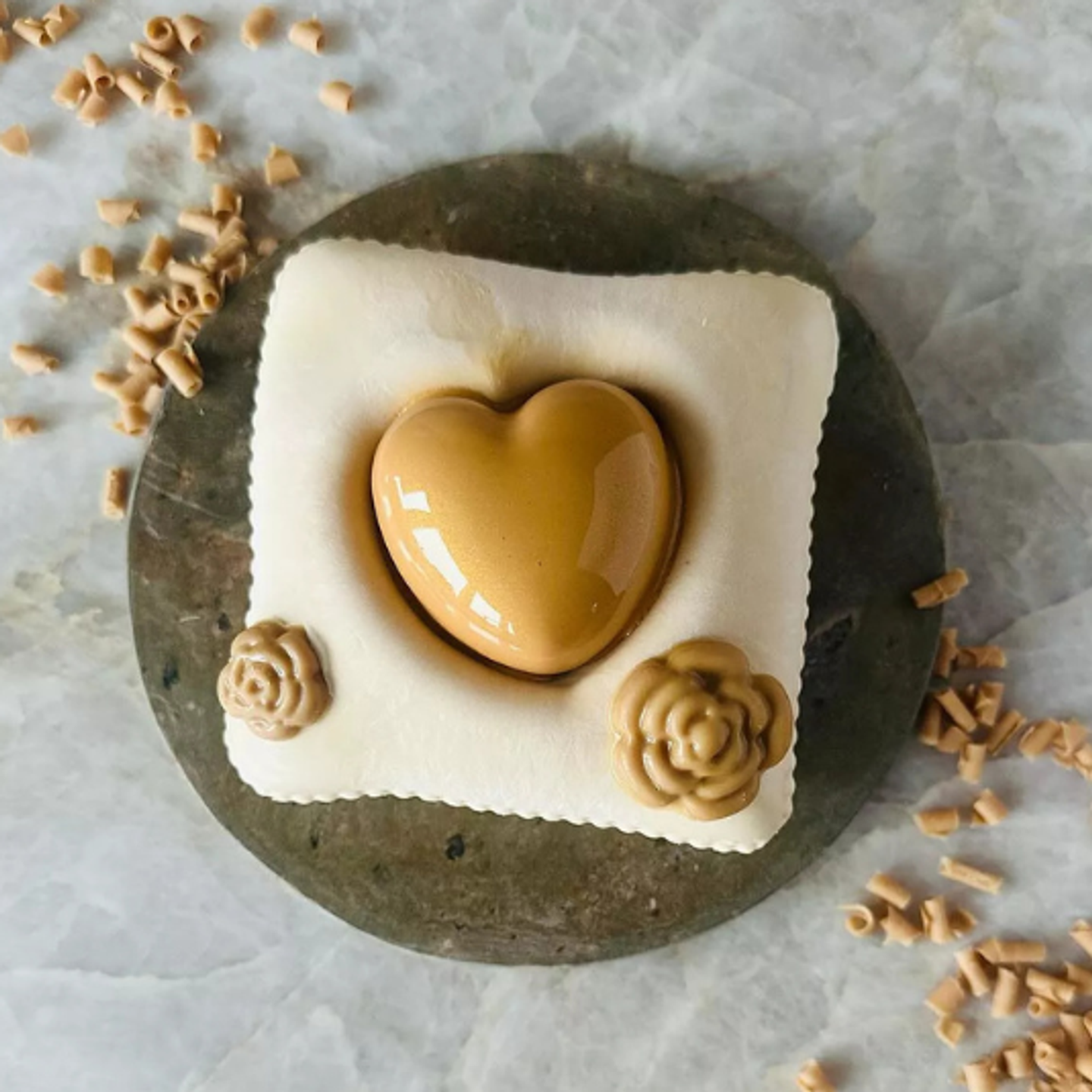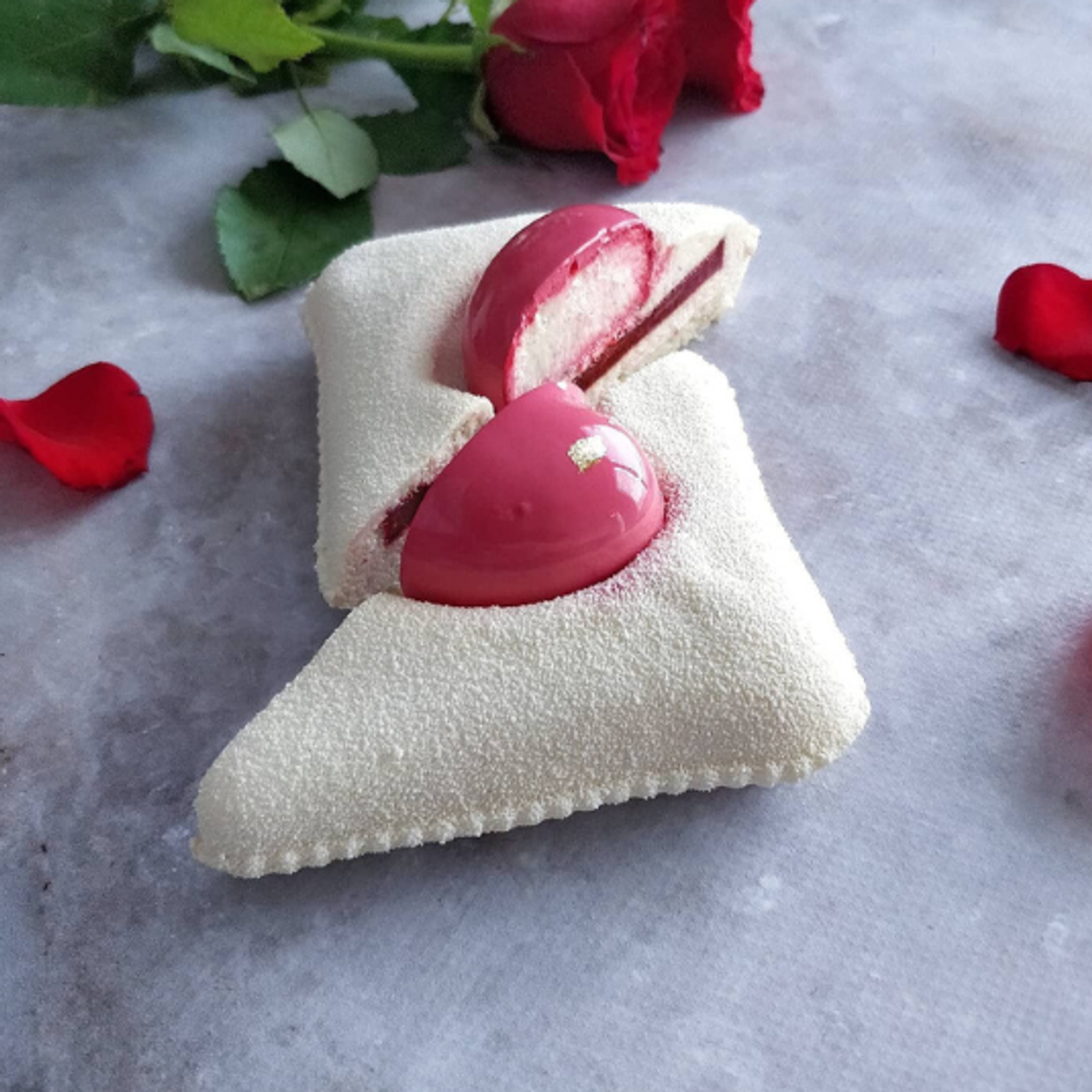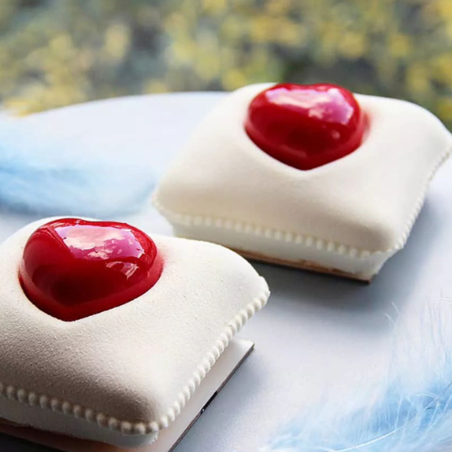 Zkombinujte jemnou mousse se srdcovou dekorací v kontrastní barvě. Pro zvýraznění tvaru použijte mirror glazuru nebo velvet efekt a doplňte dezert minimalistickým dekorem.