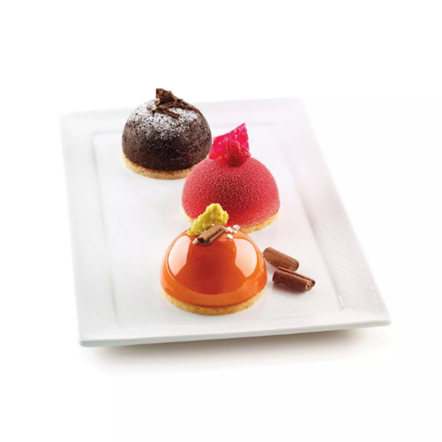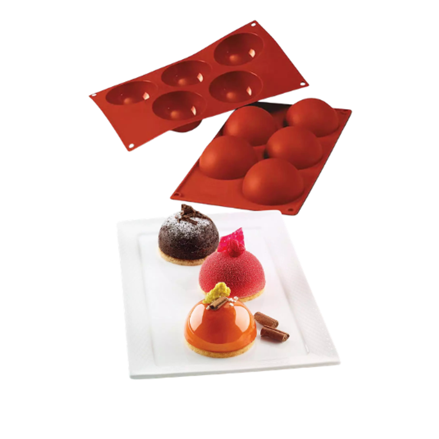 Forma je vyrobena ze 100% potravinářského silikonu, který je flexibilní, nepřilnavý a má dlouhou životnost. Dezerty lze z formy snadno vyjmout bez poškození a zachovat dokonale hladký povrch ideální pro mirror glaze, velvet efekt nebo čokoládový nástřik.