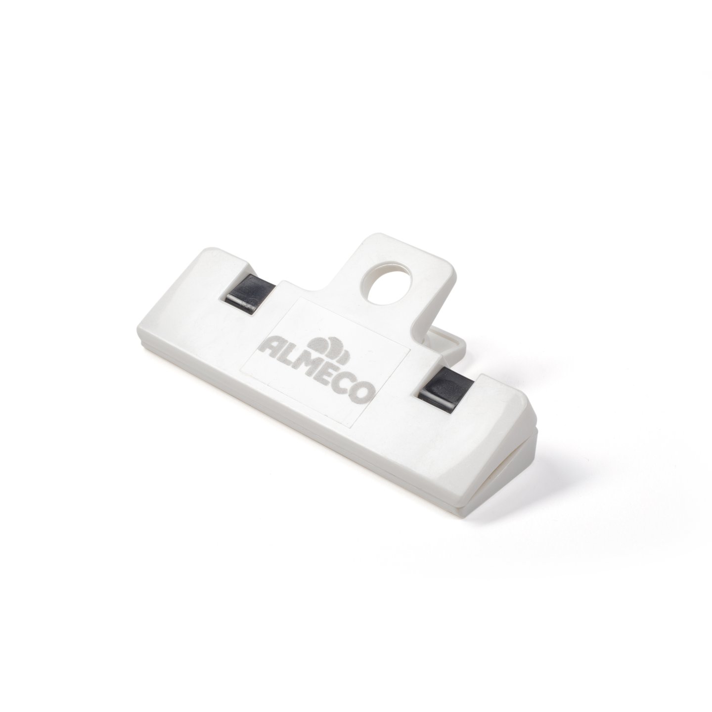 Plastový bílý klip s logem Almeco na uzavření sáčku.